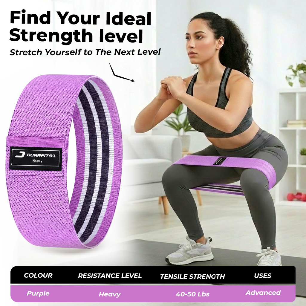 The Durafit91 Purple Hip Resistance Band is designed to effectively target and strengthen your glutes, hips, and leg muscles. Featuring Medium resistance, it is ideal for toning, strength training, and improving lower-body stability. Made from premium soft elastic with a non-slip inner grip, the band stays securely in place without rolling or slipping during workouts. Durable, comfortable, and lightweight, the Durafit91 Purple resistance band is perfect for home workouts, gym sessions, yoga, Pilates, and travel-friendly fitness training.