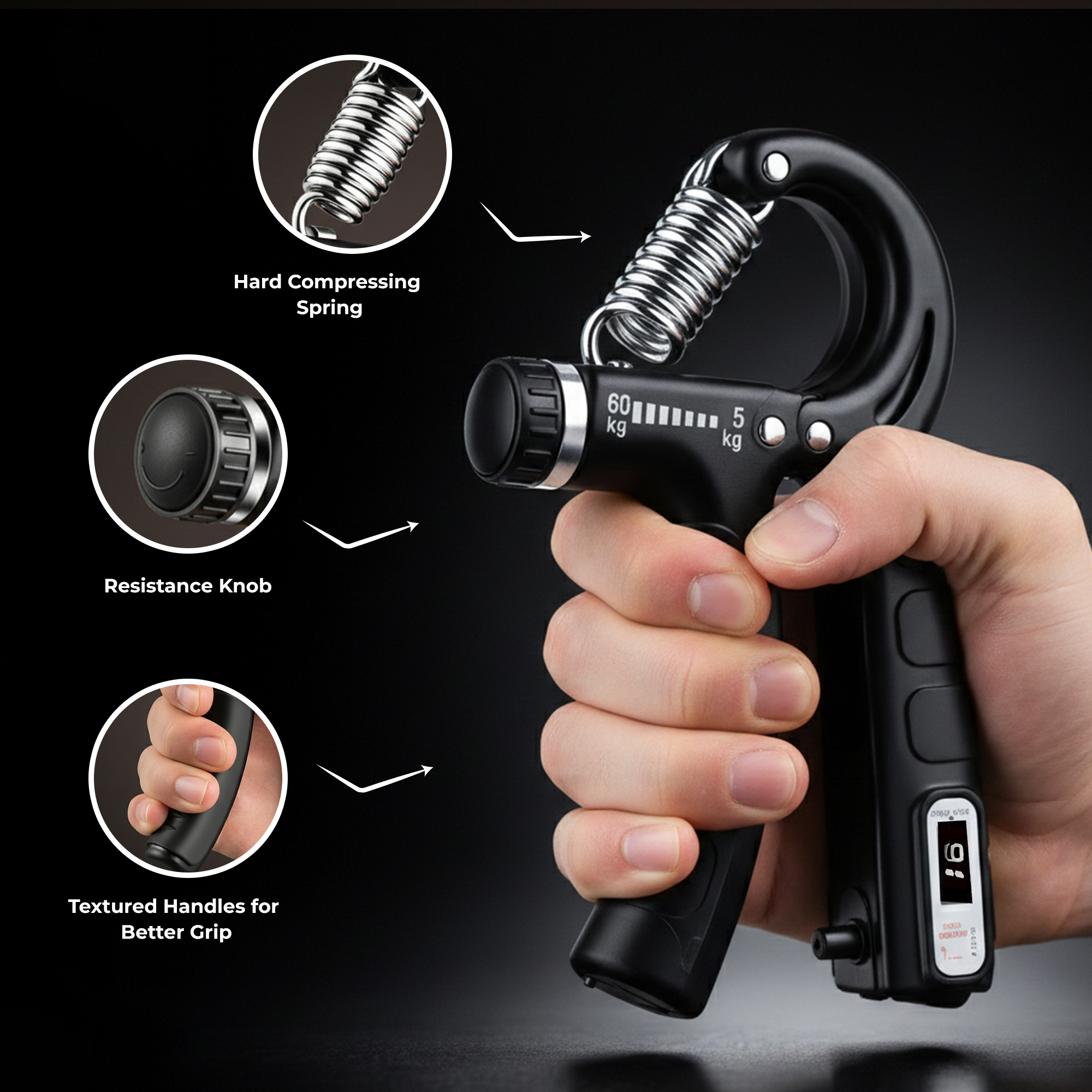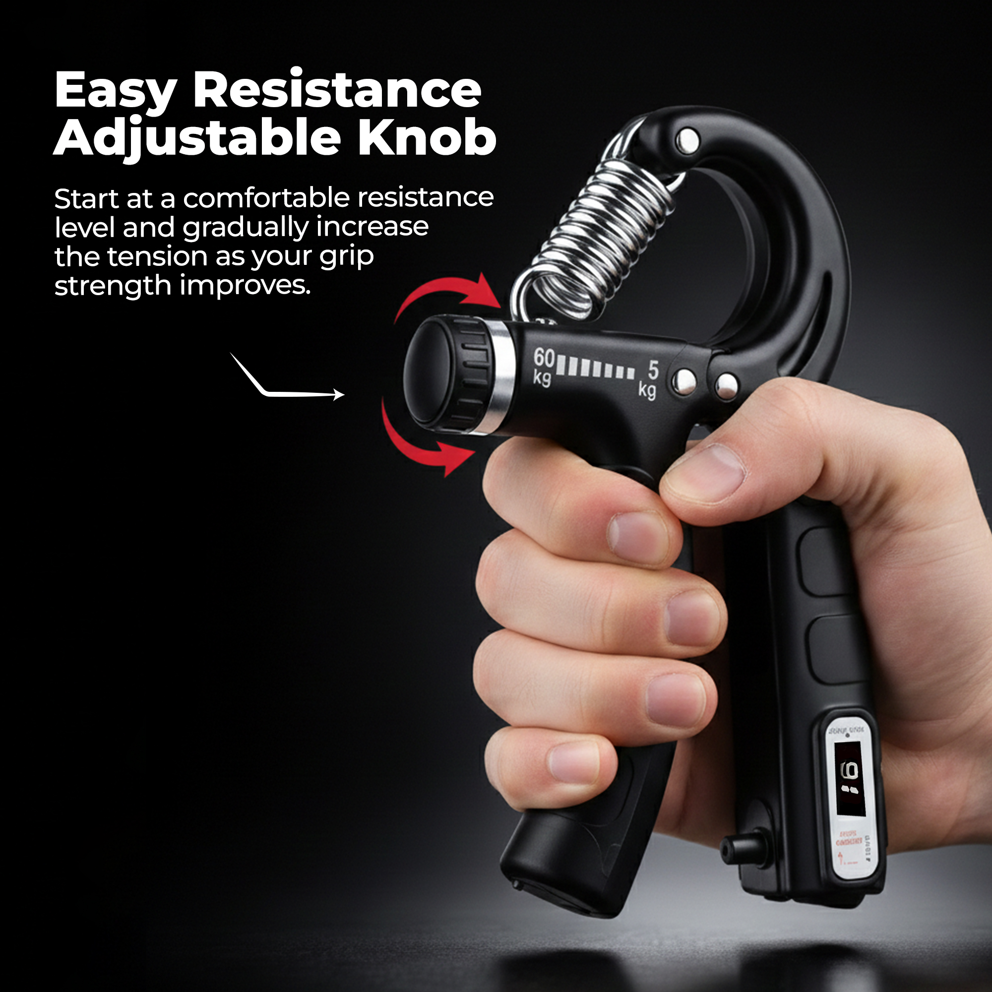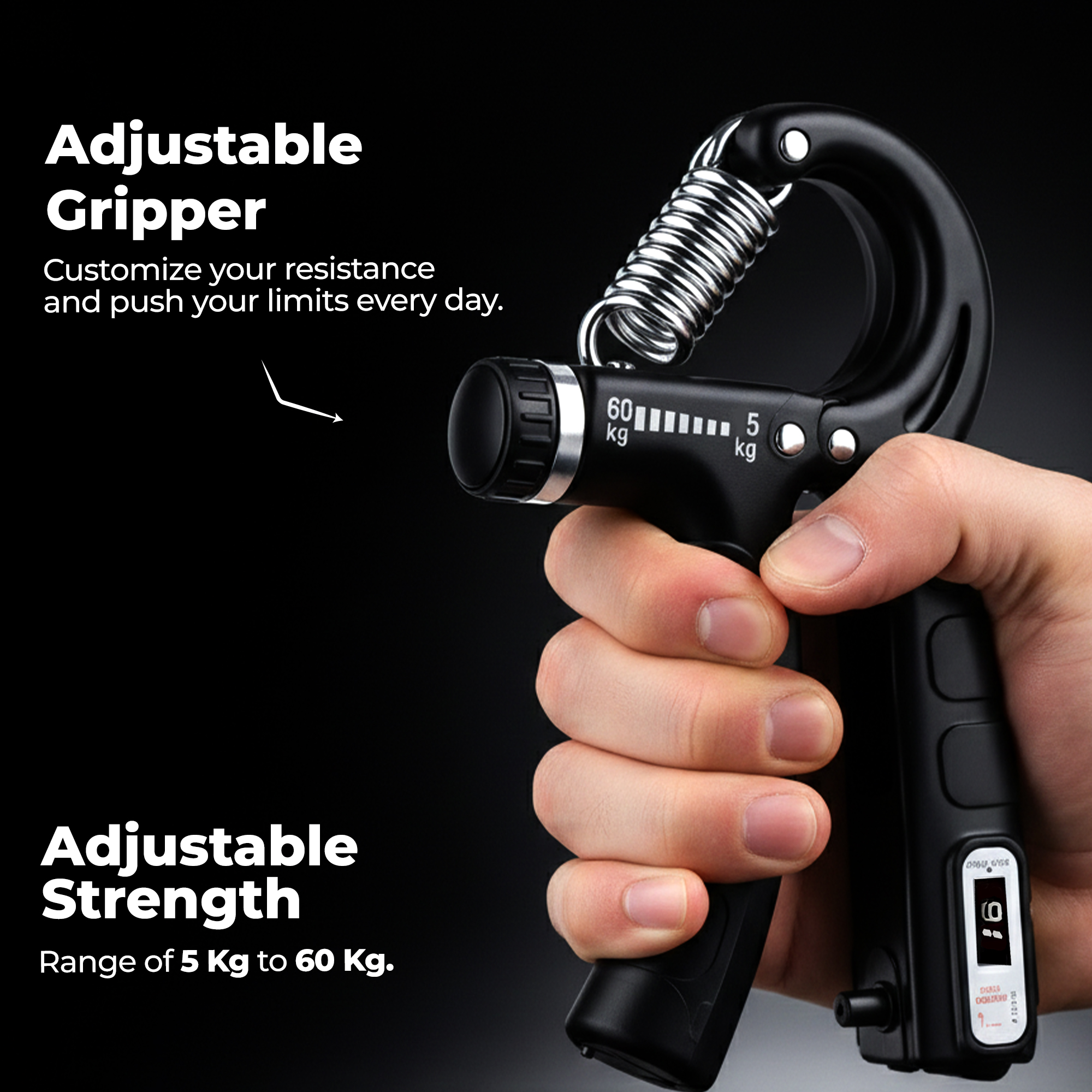 "The Durafit91 Adjustable Hand Grip Strengthener with Counter is designed to help you build stronger hands, wrists, fingers, and forearms with consistent and measurable progress. Featuring adjustable resistance, it allows you to customize the intensity of each squeeze to match your current strength level, making it suitable for beginners as well as advanced users. The built-in repetition counter makes training more effective by helping you track every rep, so you can stay focused on your goals and maintain steady improvement. Whether you are working on grip strength, muscle endurance, or recovery, this hand gripper ensures controlled and efficient workouts. Crafted with a durable metal spring and sturdy construction, the grip strengthener offers long-lasting performance while remaining lightweight and easy to use. The ergonomically designed, non-slip handles provide a secure and comfortable grip, reducing hand fatigue during extended workout sessions. Compact and portable, the Durafit91 hand gripper is perfect for use at home, in the gym, at the office, or while traveling. It operates silently, allowing you to train anytime, anywhere, and is ideal for athletes, fitness enthusiasts, musicians, and anyone looking to improve hand and forearm strength.