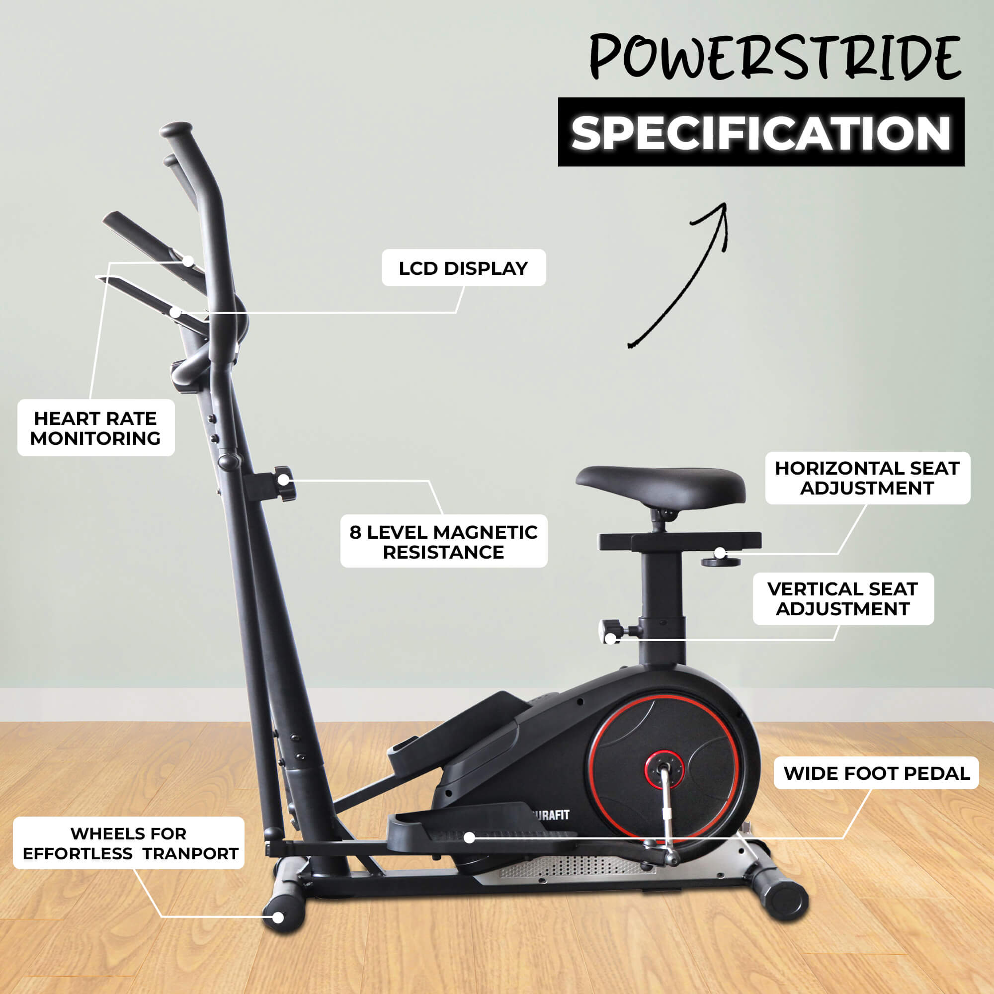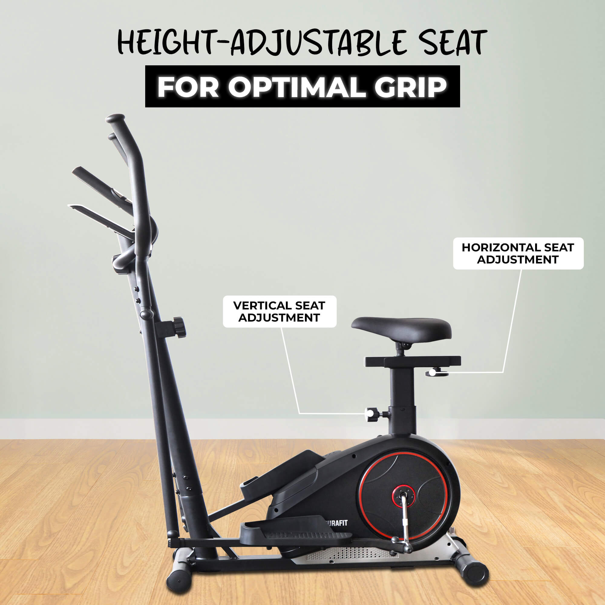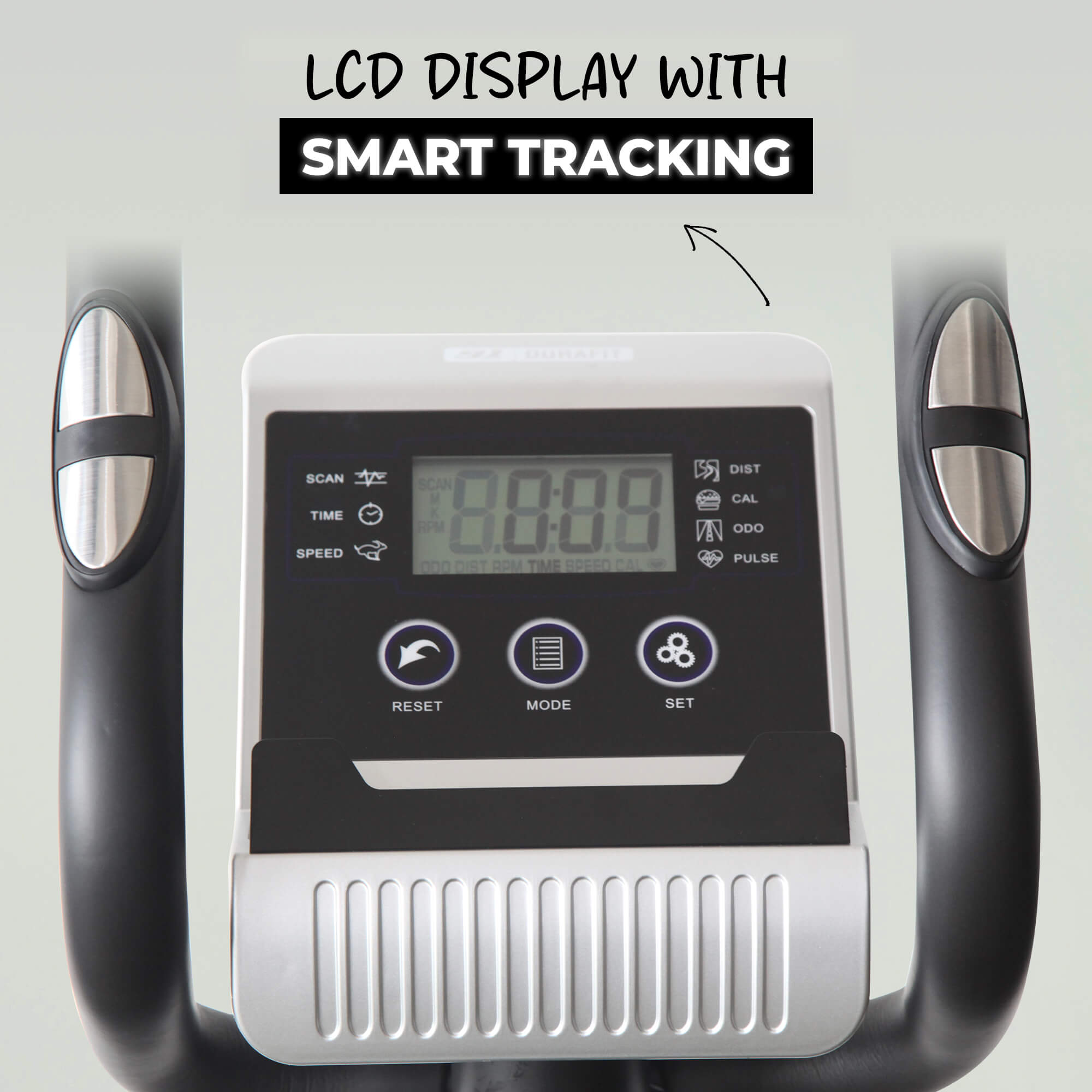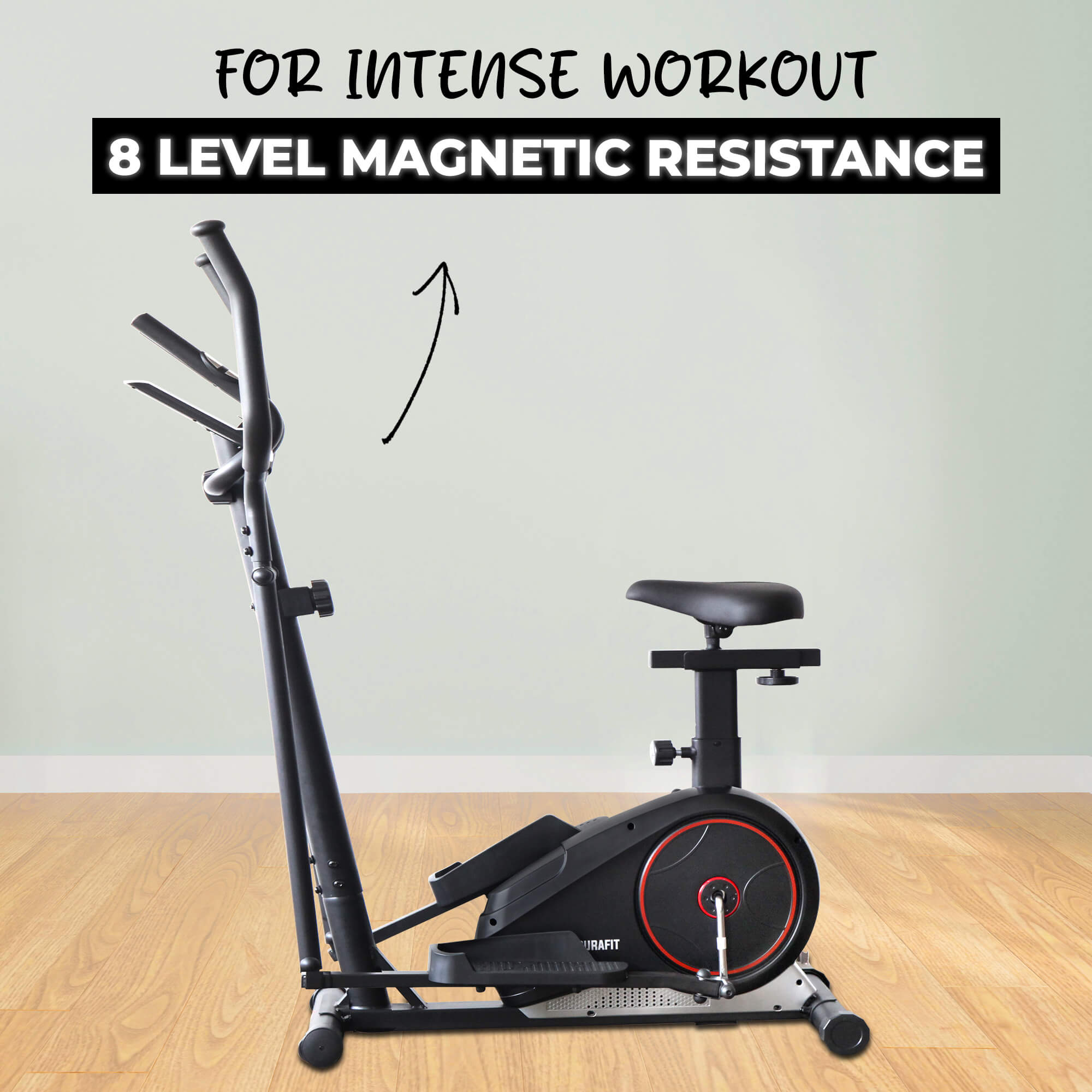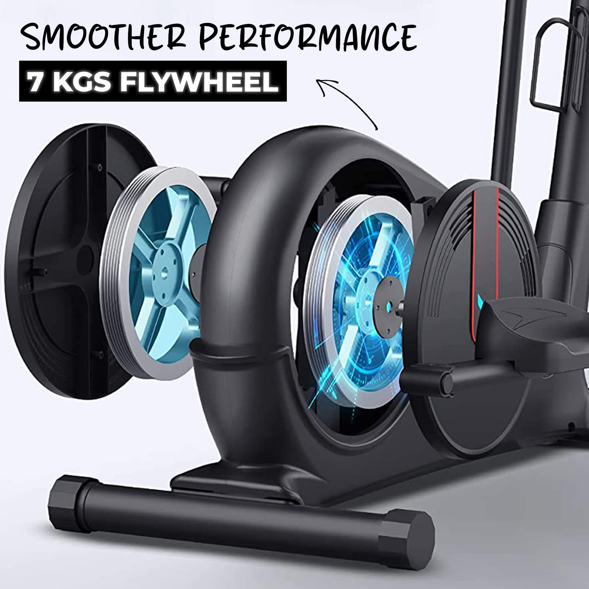 This elliptical is designed for easy and comfortable home workouts. It has a strong steel frame that supports up to 130 kg and offers smooth exercise with 8-level magnetic resistance. The adjustable seat and dual handlebars help in full-body training, while non-slip pedals ensure safety. The LCD display shows your workout details, and it comes with a 6-month manufacturer warranty for peace of mind.