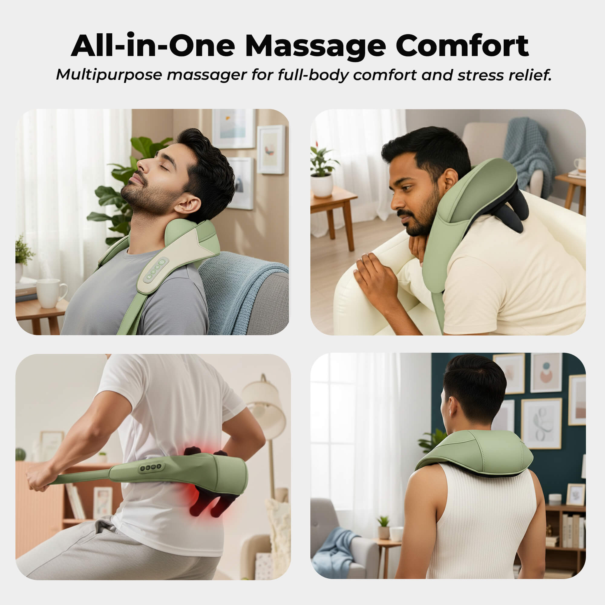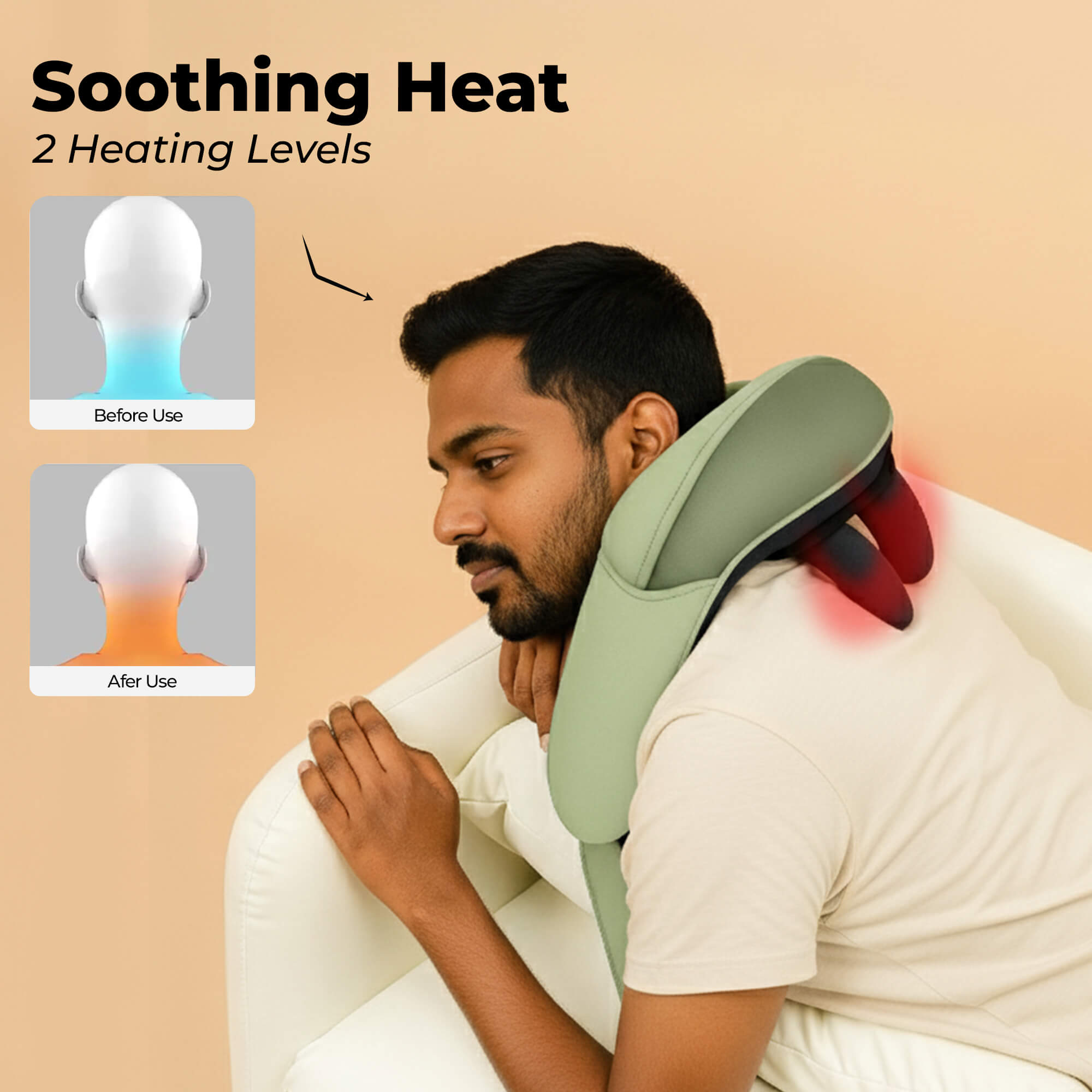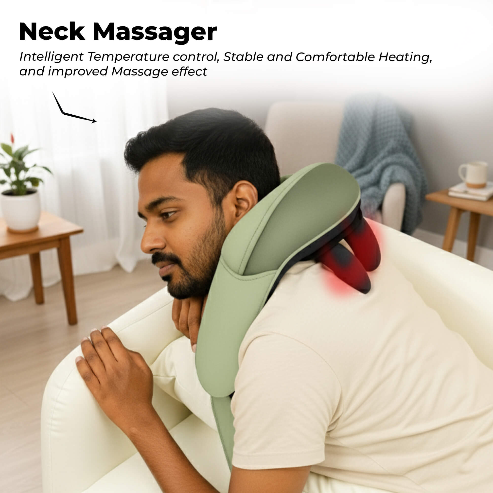 Ease tension and stress with this ergonomic neck massager, designed to fit comfortably around your neck and shoulders. Adjustable intensity and heat settings provide a personalized massage experience that targets tight muscles and knots. It promotes relaxation, improves blood circulation, and relieves stiffness caused by long hours of work or daily stress. Perfect for home, office, or travel, it transforms any moment into a soothing self-care session. Experience deep relief and comfort anytime you need it.