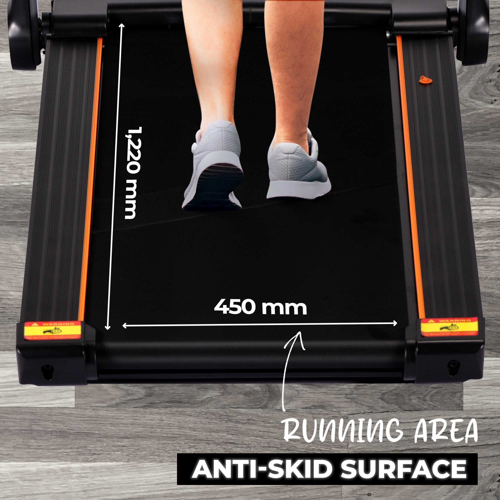 - Wide 1220 × 450 mm shock-absorbing running belt