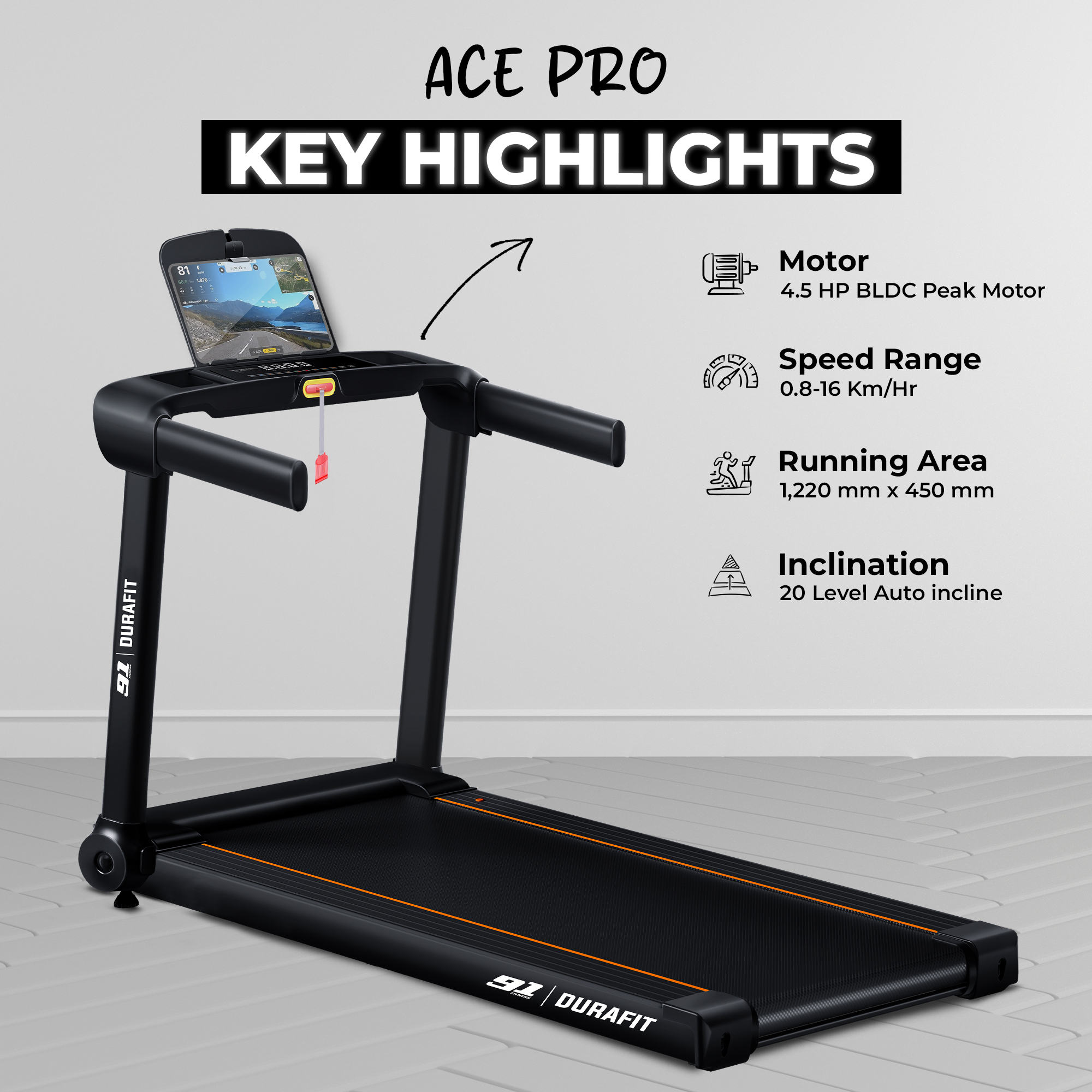 A powerful and durable treadmill for home workouts, featuring a 4.5 HP peak BLDC motor for smooth, quiet performance. With speeds up to 16 km/h, 20-level auto incline, a wide shock-absorbing running belt, and preset training programs, it delivers effective cardio, endurance, and weight-loss workouts. Designed for safety, comfort, and easy installation with a space-friendly setup.