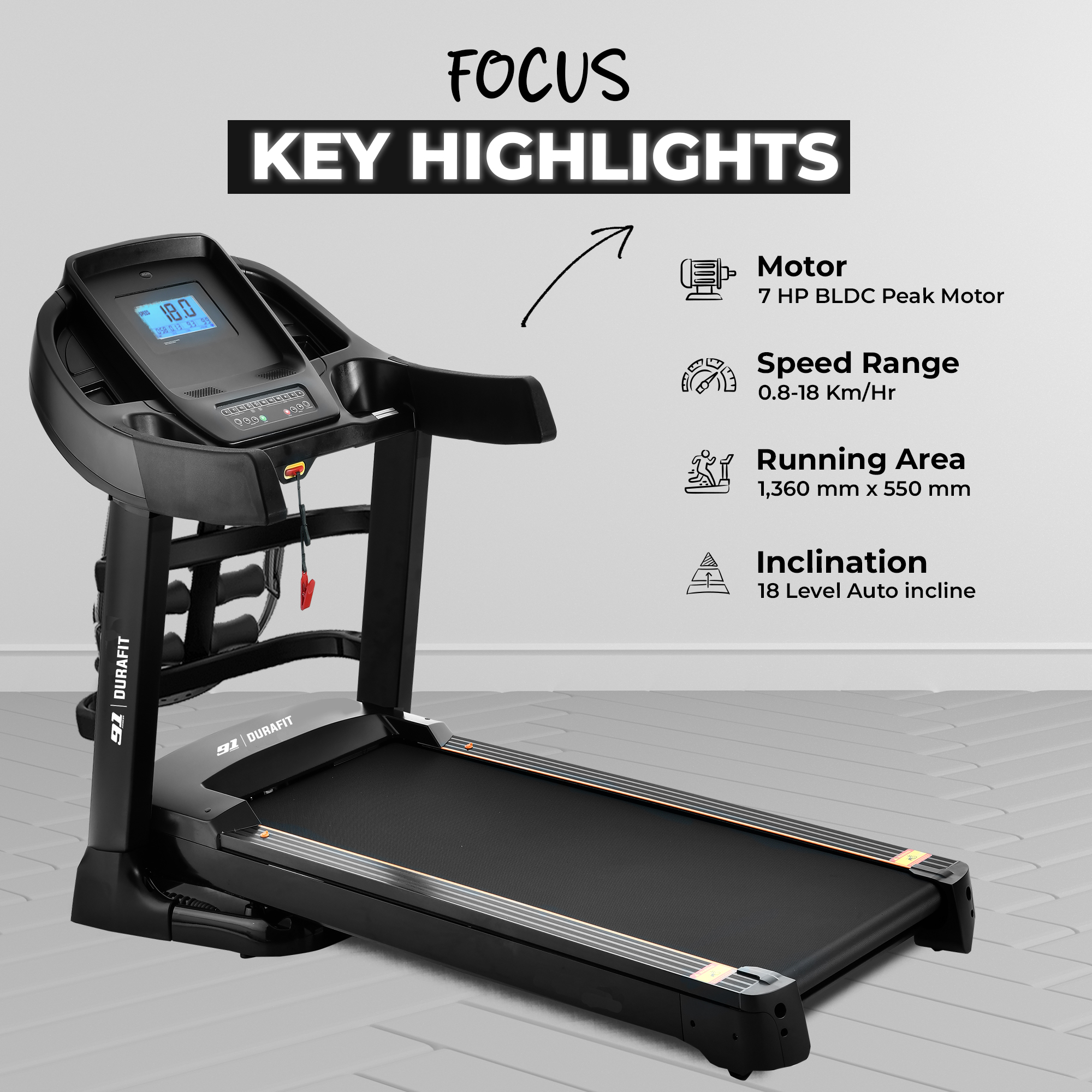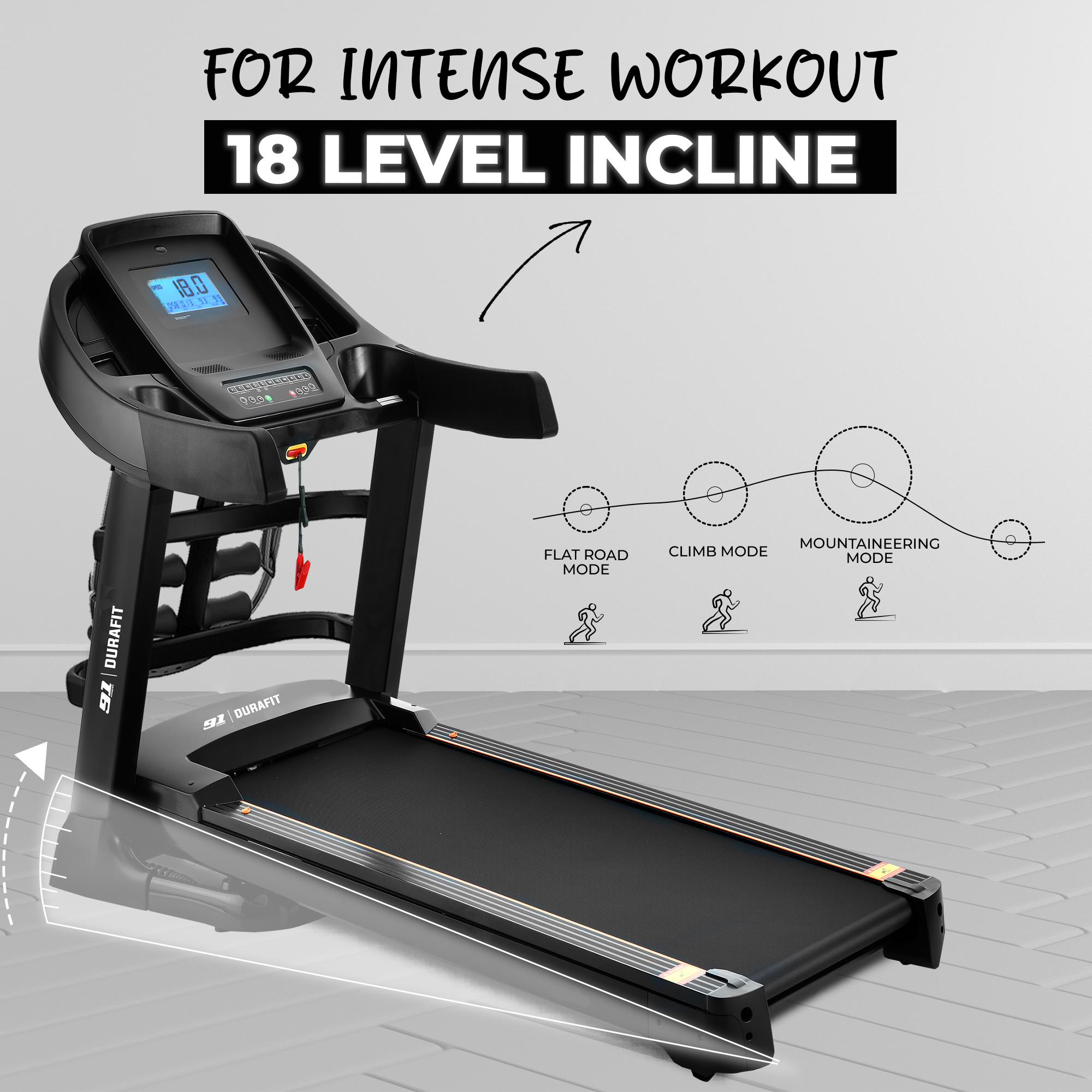 - 18-level auto incline for intense training and calorie burning