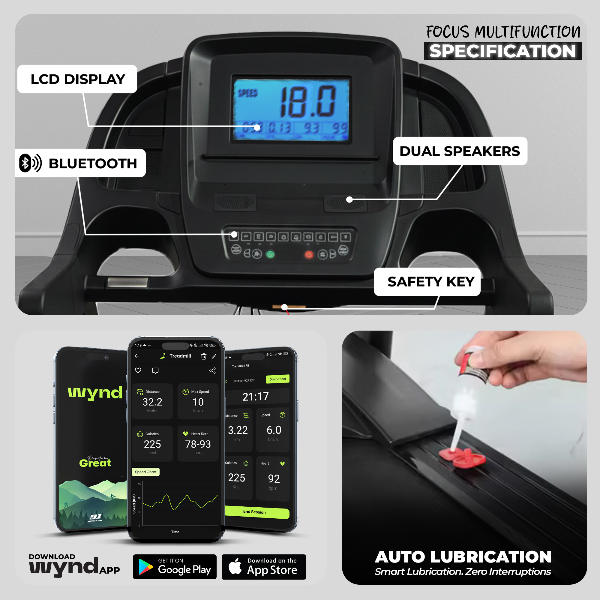 - Speed range 1–18 km/h for walking, jogging, and running