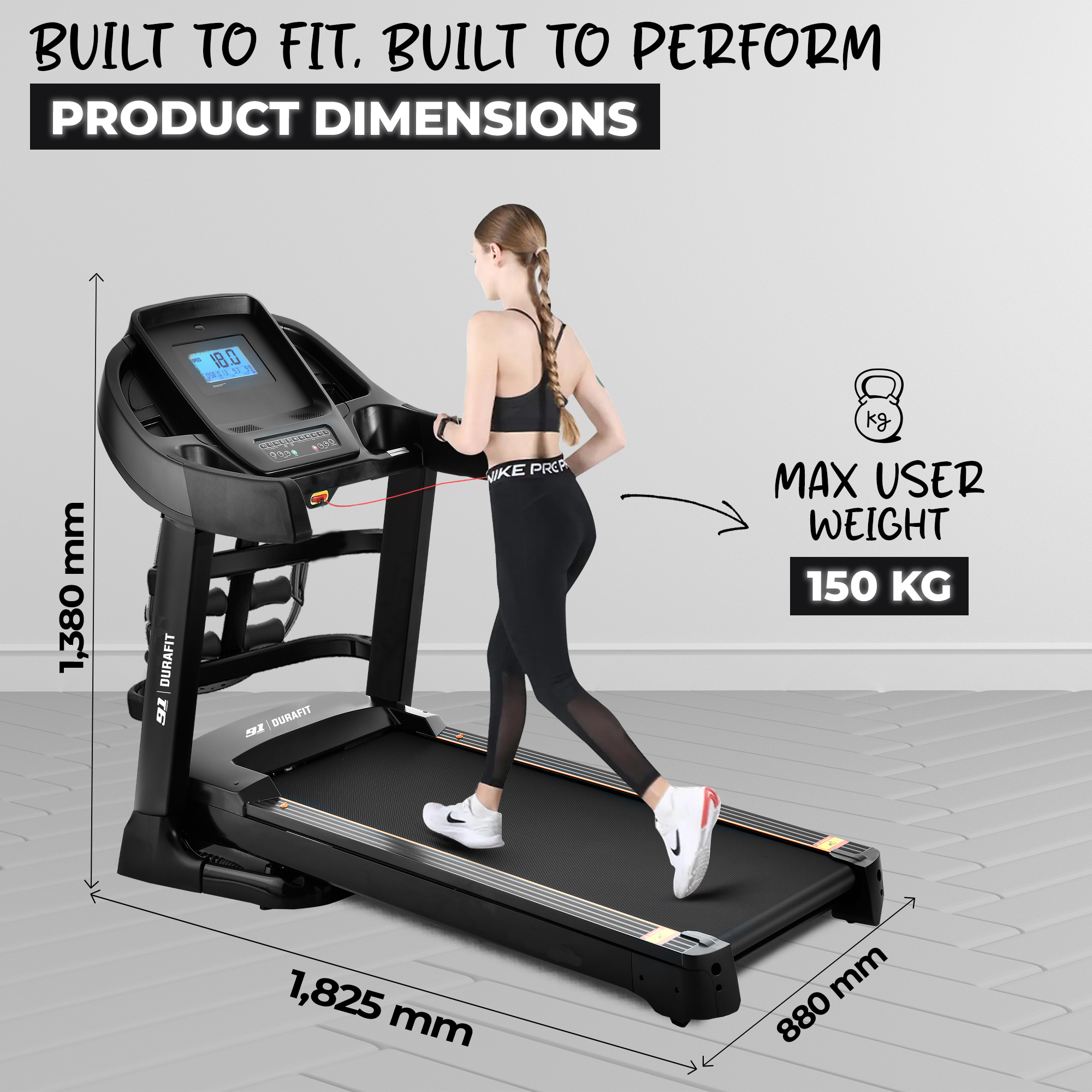 - Heavy-duty frame supports 150 kg (walking) / 120 kg (running) for stability