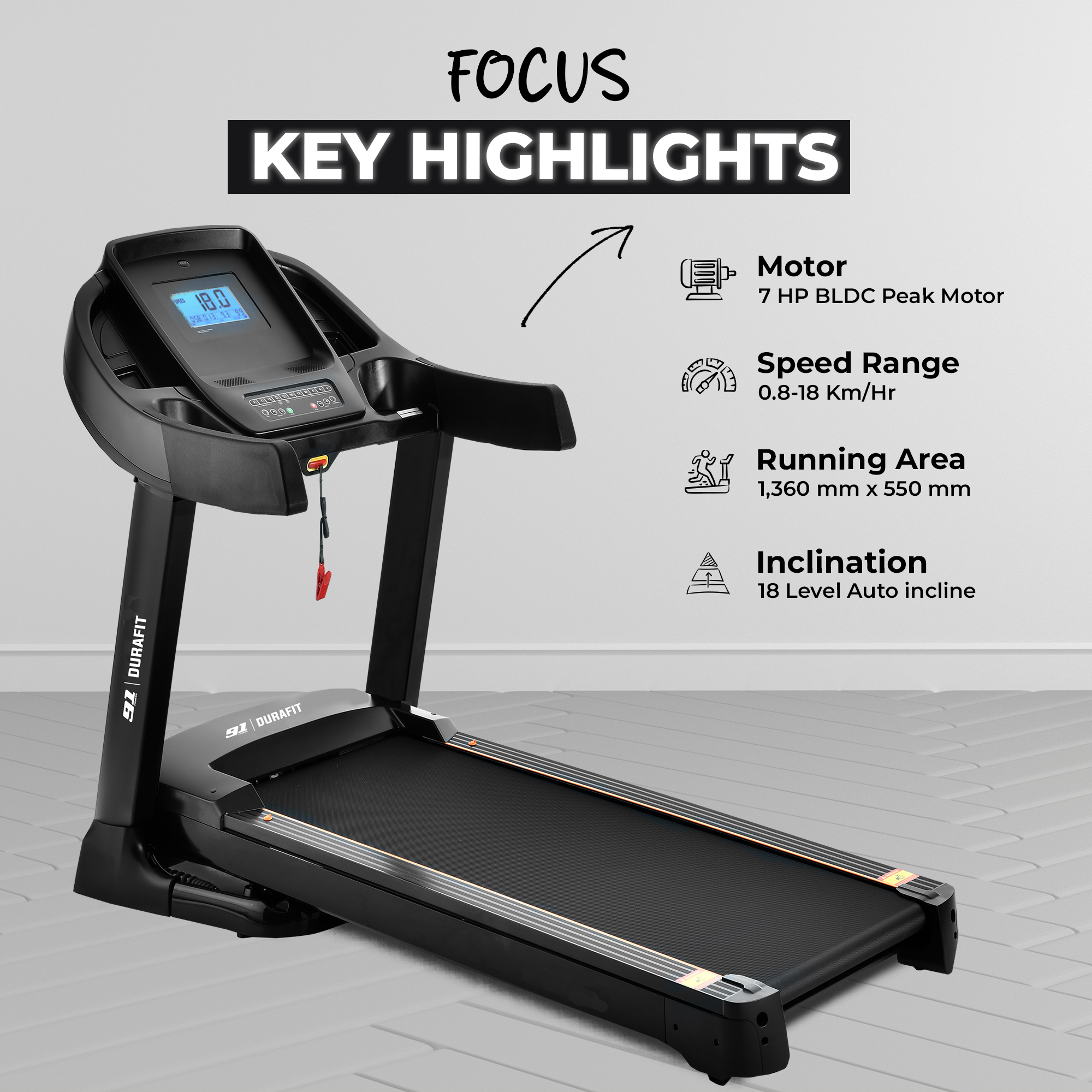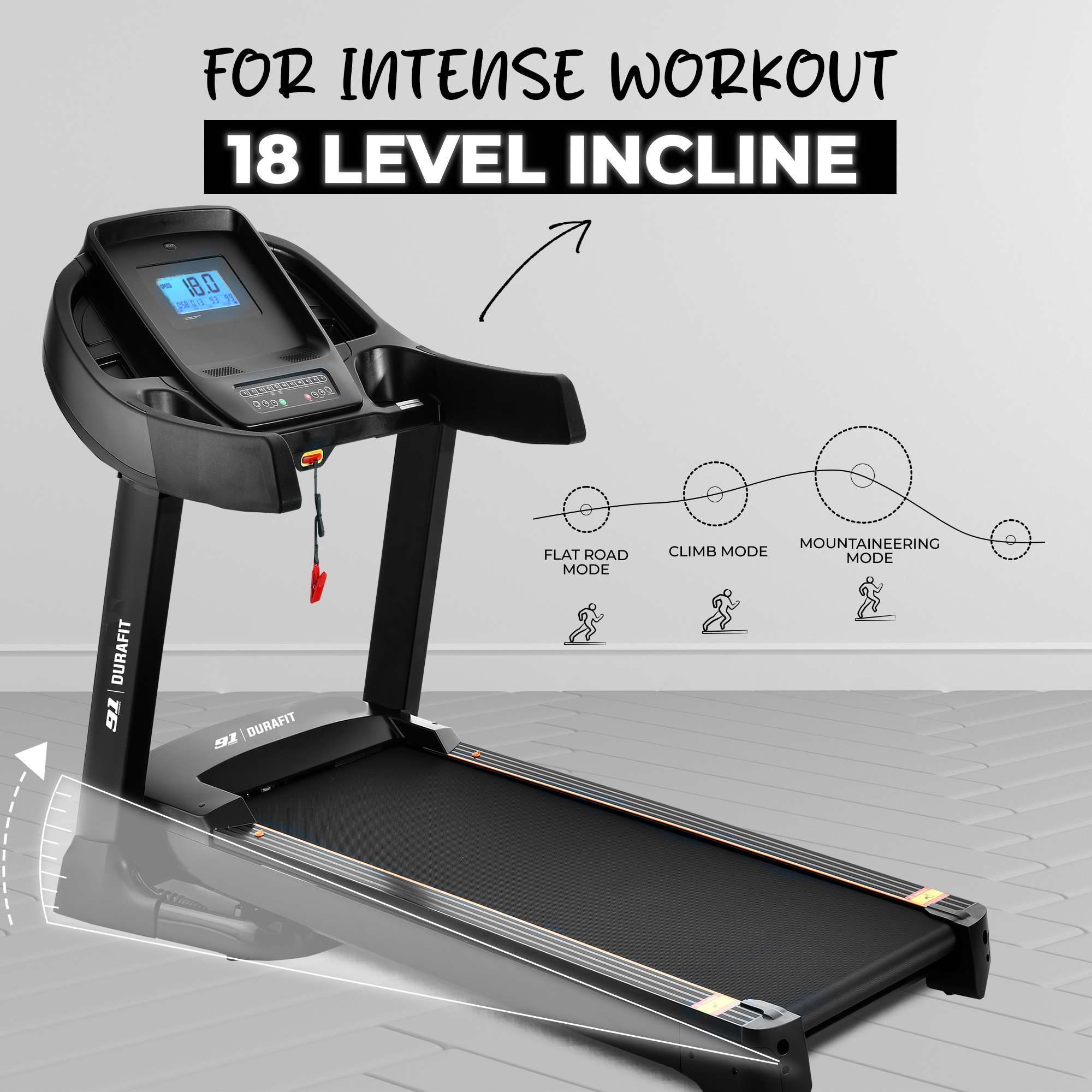 - 18-level auto incline for intense training and calorie burning