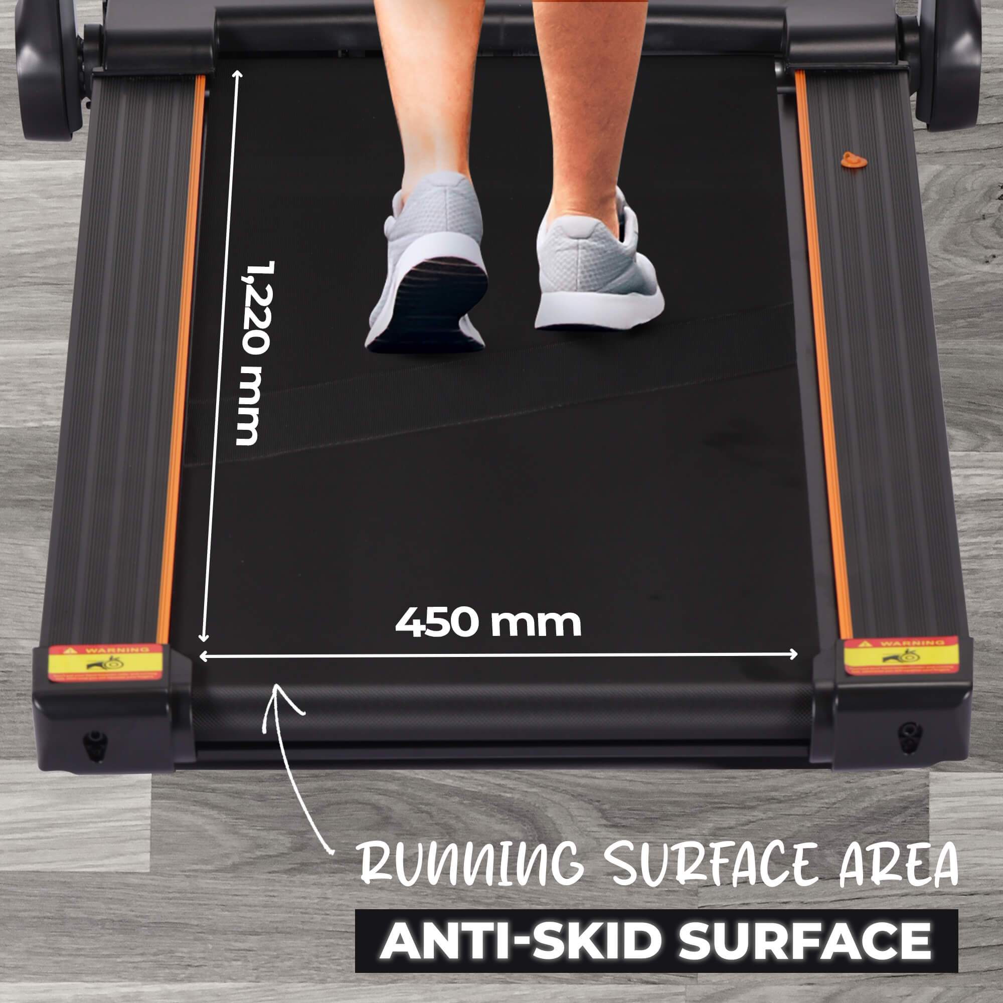 - Wide 1220 × 450 mm shock-absorbing running belt