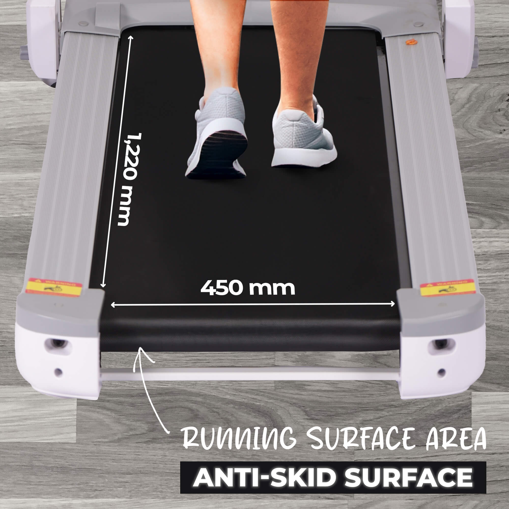- Spacious 1220 × 450 mm gel-cushioned running belt for comfortable strides