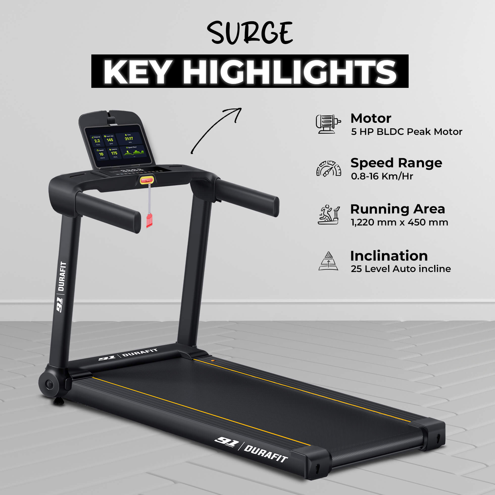 High-performance 5 HP Brushless BLDC treadmill with speeds 0.8–16 km/h and 25-level automatic incline. Features 12 preset workouts, 1220 × 450 mm cushioned running deck, handrail controls, and heavy-duty frame for up to 140 kg. Pre-assembled 80% with LED display and 1-year warranty.