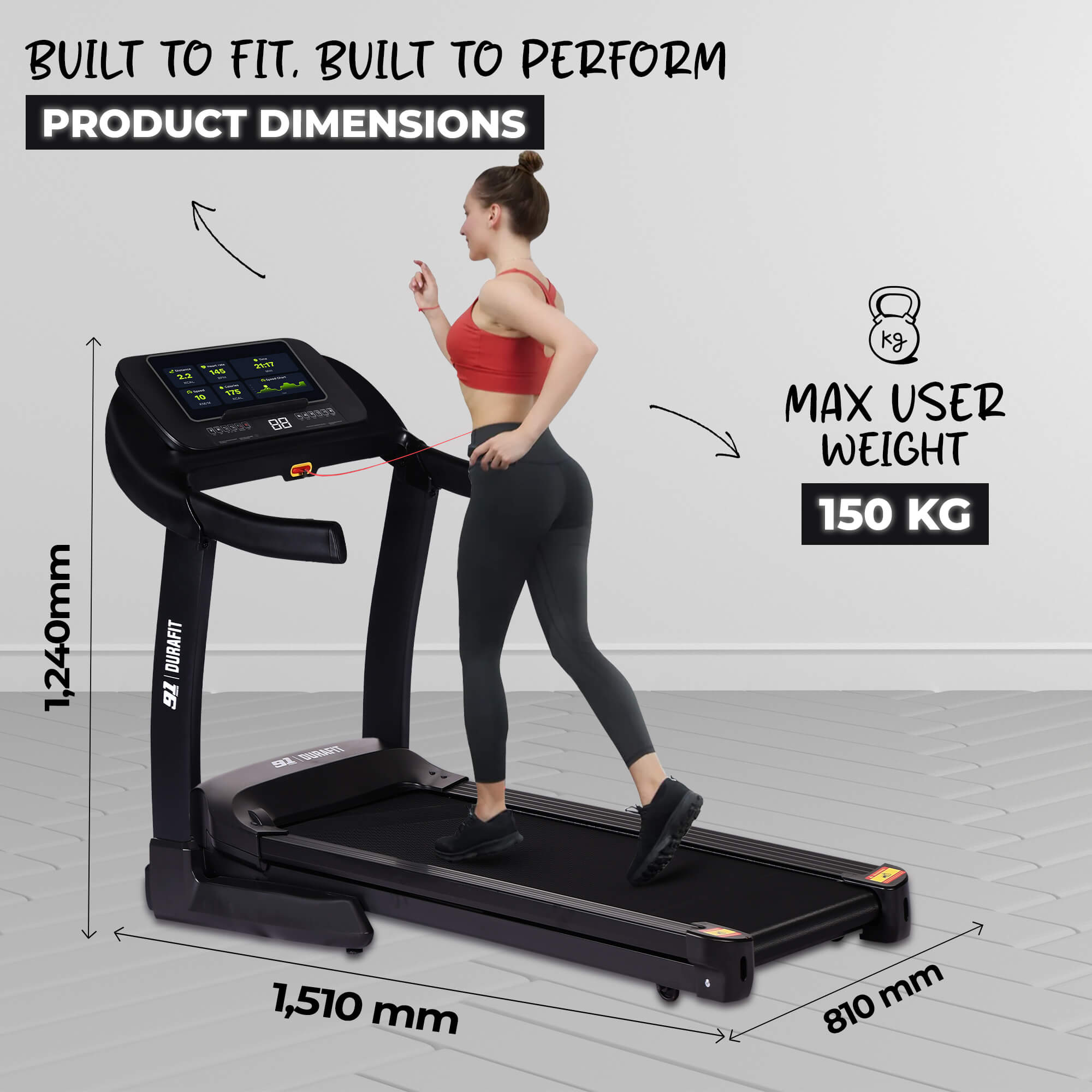 - Heavy-duty frame supports 150 kg (walking) / 120 kg (running)