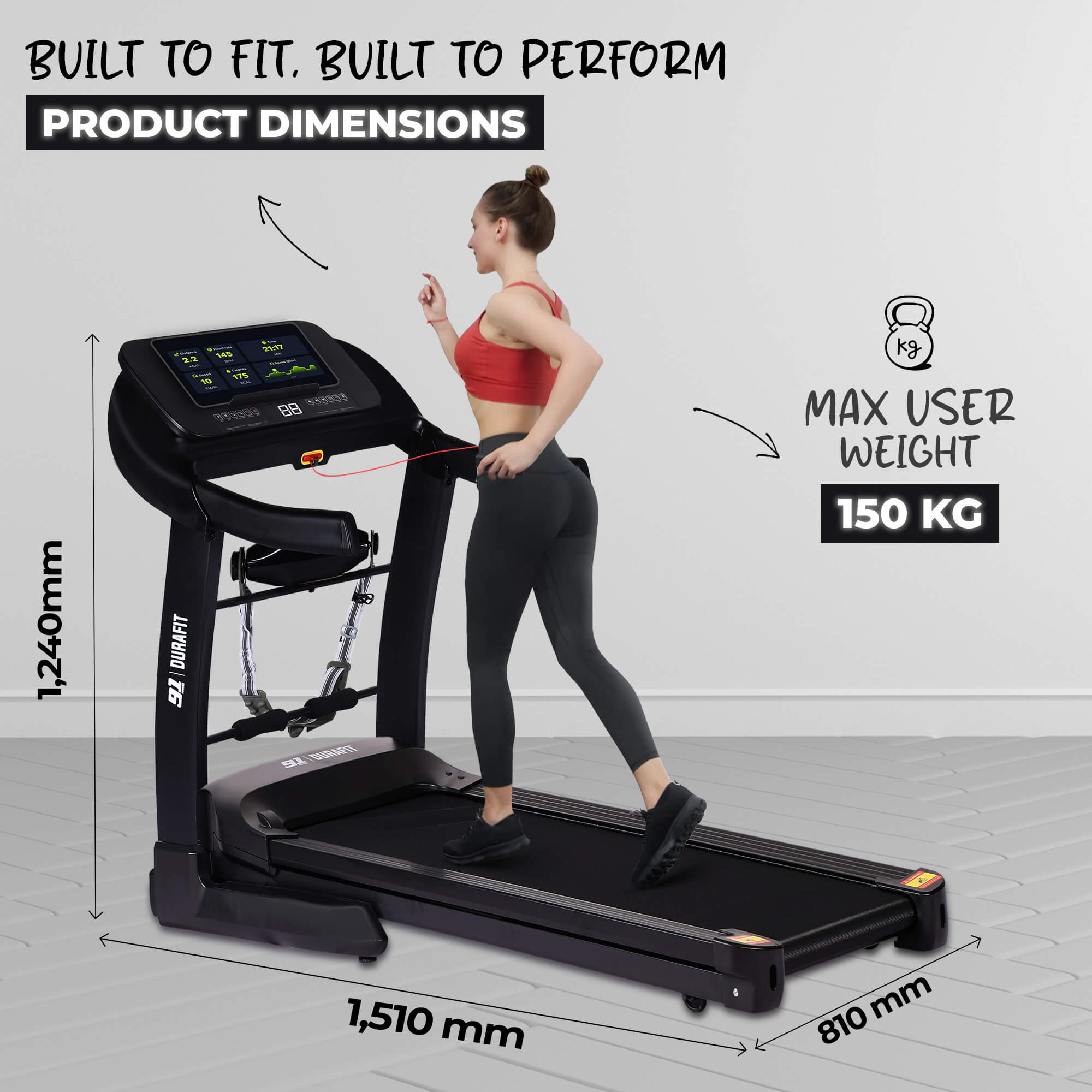 - Heavy-duty frame supports up to 150 kg (walking) and 120 kg (running)